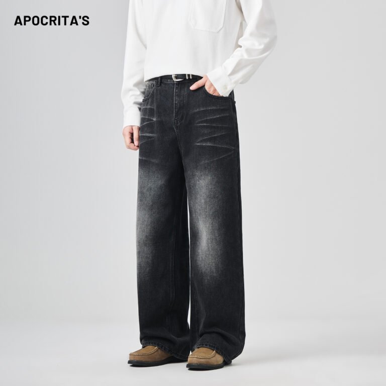 APO Men’s Black Jeans Winter American High Street Trendy Loose Straight-leg Long Pants Reach Floor