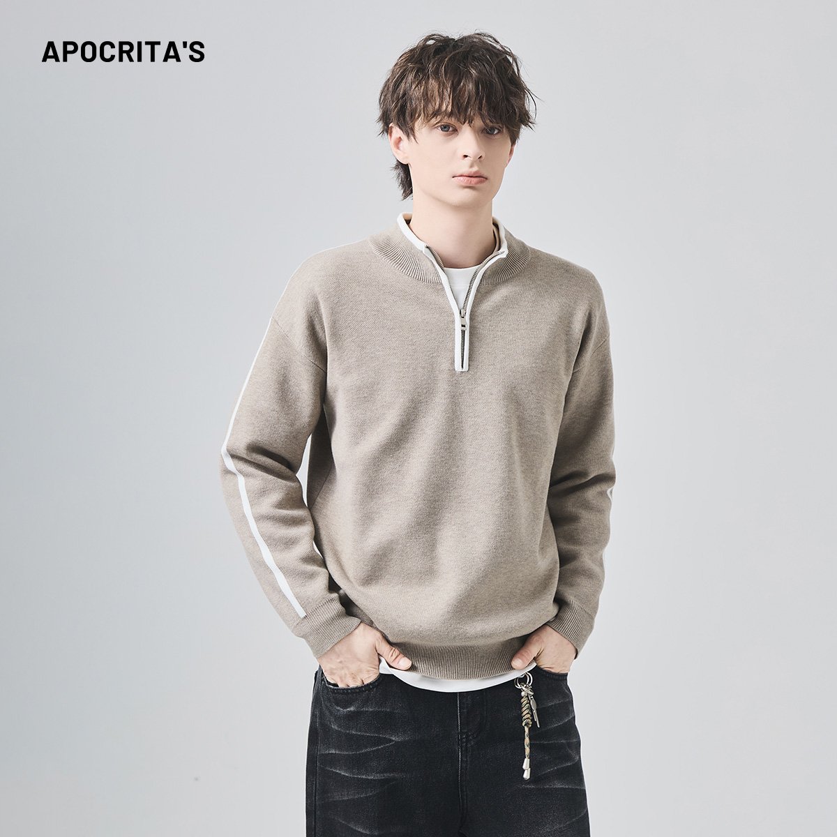 APO Men’s Sweater Fall/Winter Loose Laid-back Color-matched Patchwork Half-zip Wool Long-sleeved Knitted Shirt Sweater