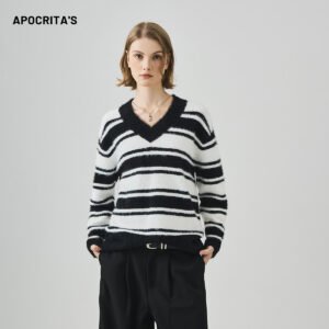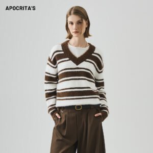 APO Stock V-neck Sweater for Women Loosecasual Stylelong-sleeved Striped Knitted Top Autumn Korean Style