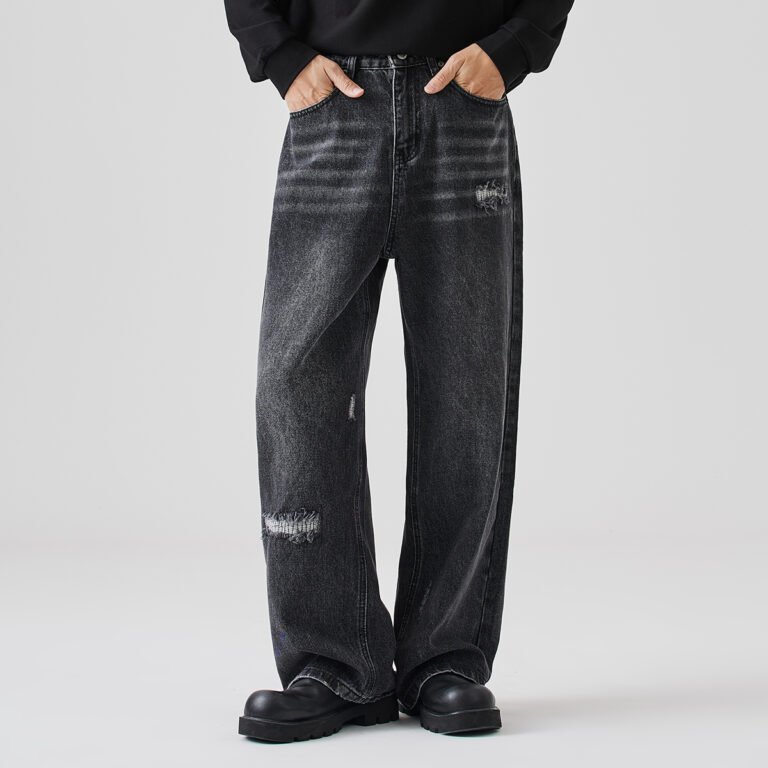 APO Fall/Winter High-end Washed Denim Pants for Men – Trendy Hole-out Style – Korean Edition – Loose-Fitting Straight Leg Casual Pants