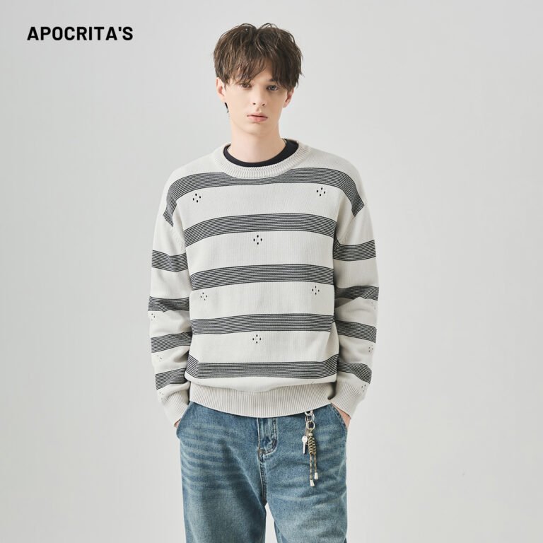 APO Men’s Cotton Ragged Sweater Autumn Loose Round-neck Laid-back Style Striped Long-sleeved Knitted Shirt Sweater
