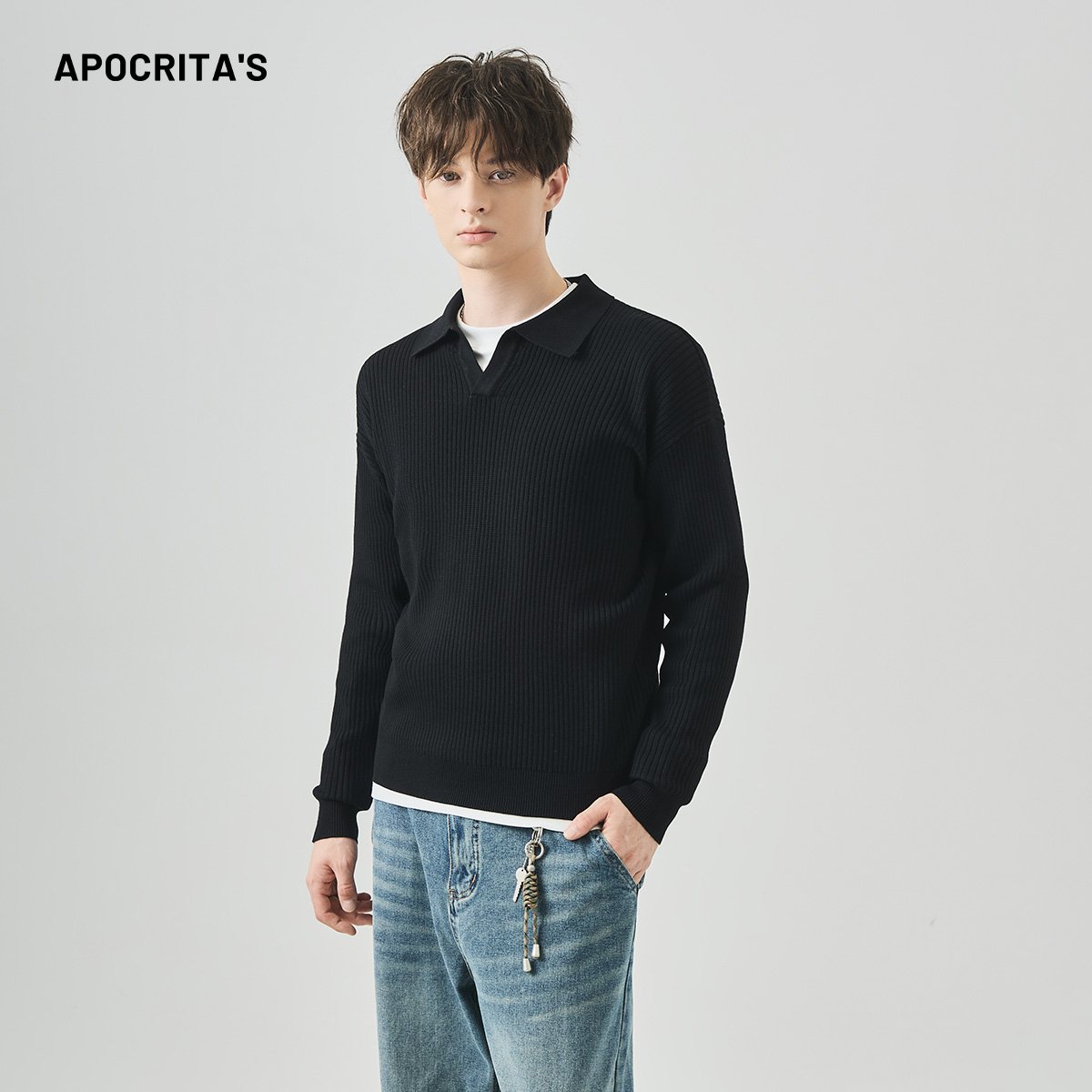 APO Men’s Loose-fitting Korean-style Seagull Collar Polo Shirt Turnover Collar Long-sleeved Sweater for Autumn