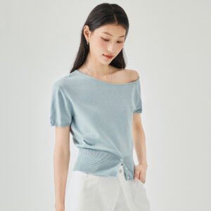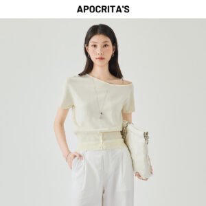 APO Summer lightweight off-shoulder or half-sleeve top short sleeves fitted waist – stylish versatile slimming down perfect for women Knitted T-shirt