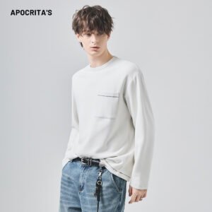 APO Long-sleeved T-shirt for Men Autumn Loose Fit Round Neck Versatile Soft Smooth Solid Color T Shirt